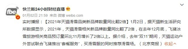 值得一提的是,天猫新生活研究所数据显示,2021年天猫滑雪相关新品牌数量同比翻了2倍。今年冬天上百个时尚大牌在天猫奢品发售滑雪类运动装备,包括服饰、头盔、滑雪板等。