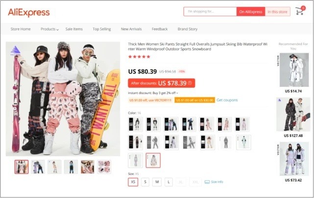 以VECTOR品牌为例,2016年8月该品牌创立,由于国内滑雪装备市场还处在成长期,VECTOR选择了国内和海外同时发展。主打“年轻人的第一套滑雪套装”,相比入门爱好者的装备,VECTOR有更专业的科技含量,再加上友好的价格,在速卖通平台连续3年海外市场销售额增长超过150%。